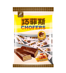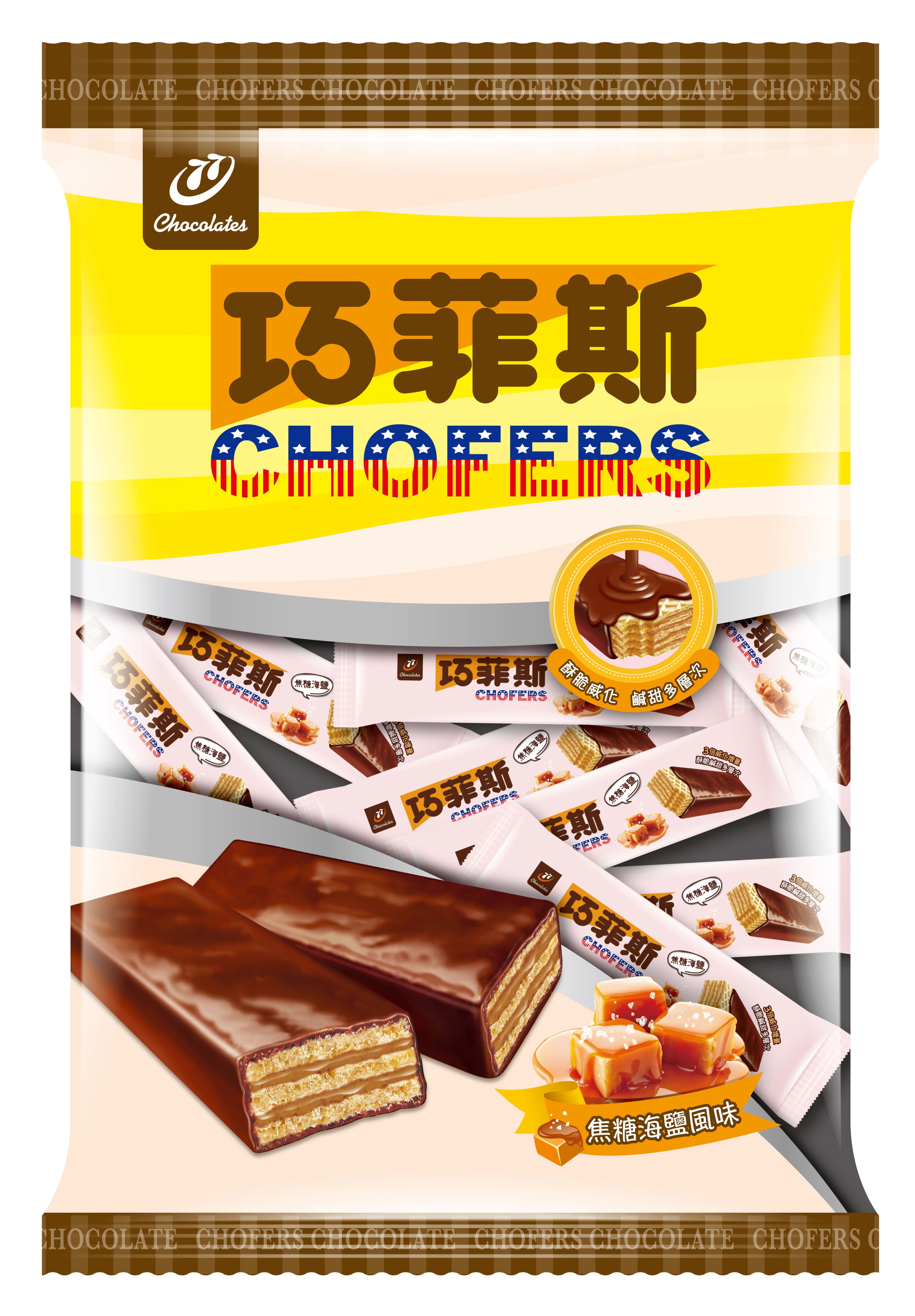 以香醇巧克力包裹著酥脆威化,搭配著焦糖海鹽夾心,鹹甜好滋味,迷你一口大小,入口輕脆讓你一口接一口,廣受成人或小朋友的歡迎